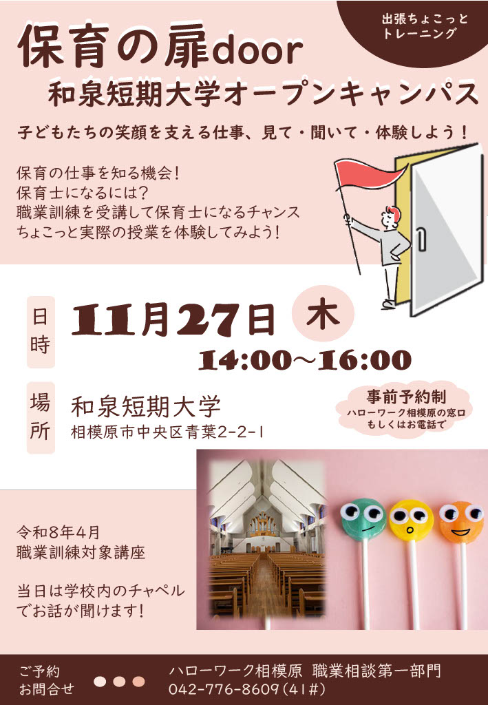 ハローワーク相模原主催「保育の扉door 和泉短期大学オープンキャンパス」(事前予約制)が開催されます。