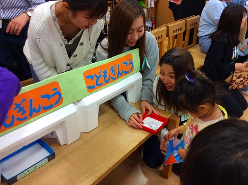 様々なお店屋さんに、ご家族もわくわくし、学生も子どもたちと触れ合うことができ、ともに楽しめるひと時となりました。お楽しみでは、1年生のお姉さんたちが手遊び「ぱんだ うさぎ こあら」に続いて大型絵本「へんしん トンネル」を読み、「とけい とけい とけいと けいと けいと…」と途中から一緒に変身を楽しみました。
