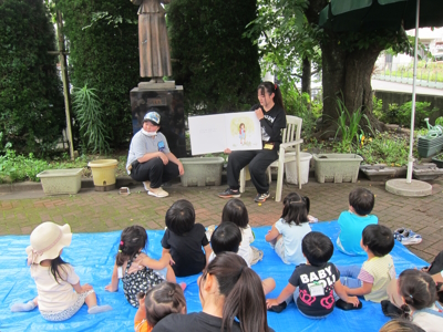 天気に恵まれ、外の砂場や乗り物で楽しんだり、室内では造形コーナーとして「紫陽花づくり」を行いました。学生が授業で学んだ内容を「地域の子ども達に楽しんでもらいたい」と事前準備から取り組みました。そして、ホールでは、ボウリングコーナーを設置し、ペットボトルを装飾しながらピンを作成しました。また、お楽しみ時間は、普段の室内と異なり、外の木陰で学生たちが手遊び等を行いました。最後はホールで体操を行い、楽しい時間を過ごすことができました。