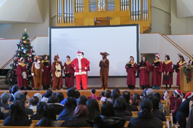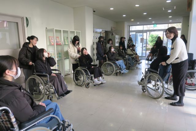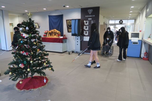はじめに、「福祉支援体験」として、2グループに分かれて①車椅子、②白杖の体験を行いました。続いて、「子どもと過ごすクリスマス体験」として、本学の子育て支援プログラム「はっぴい」のクリスマスコンサートに参加しました。
