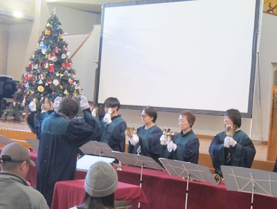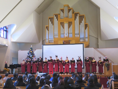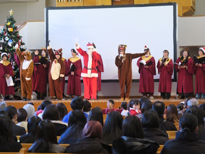 コンサートは「ハンドベル」履修学生によるクリスマスソングのハンドベル演奏、学生聖歌隊によるクリスマスソングと讃美歌、学生による絵本「いちばんはじめのおくりもの」の読み聞かせ、学生とお子さんたちが一緒に歌ったり踊ったりする時間もあり、盛りだくさんのプログラムでした。参加したお子さんたちは、コンサート会場入り口でツリーにオーナメントで飾り付けたり、途中からサプライズで登場したサンタクロースとトナカイとも一緒に歌い、大いに楽しんでいました。