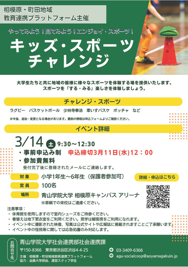2026 年 3 月 14 日(土)、青山学院大学 相模原キャンパス アリーナにて「 キッズ・スポーツチャレンジ 」が開催されます。本学学生もボランティアスタッフとして参加します。
