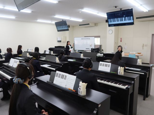 保育室そのものの環境を模したCDC(キャリアデザインセンター)では、保育力支援者により説明を受けたり、練習・指導用ピアノが多くおかれているML(ミュージックラボラトリー)では、「子どもと音楽」の授業体験で鍵盤練習に真剣に取り組んだり、ラーニングセンター WILL(ウィル)では、学生に配付される学内メールアカウントや授業で活用するGoogle Classroomの導入設定に取り組むなどを行いつつ、移動時間や休憩時には、入学生同士が談笑する光景が見られ、本日も少し仲間が増えた入学前教育になりました。
