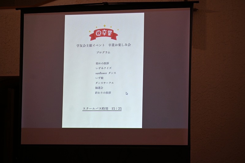 終盤には学友会からのサプライズ・プレゼントとして、和泉での思い出を記録したムービーを上映。学友会会長の感動の挨拶をもって、約一時間半のプログラムが終了しました。