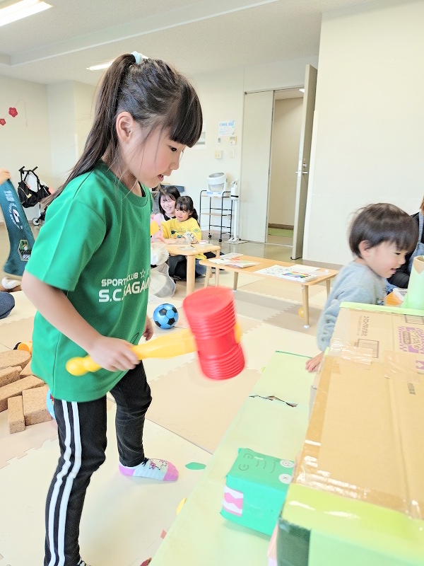 7 名のお子様は全員リピーターで、雪の為中止となったゲームのリベンジとばかりに、本学の学生が授業で手作りした「ワニたたきゲーム」などで思い切り遊びました。