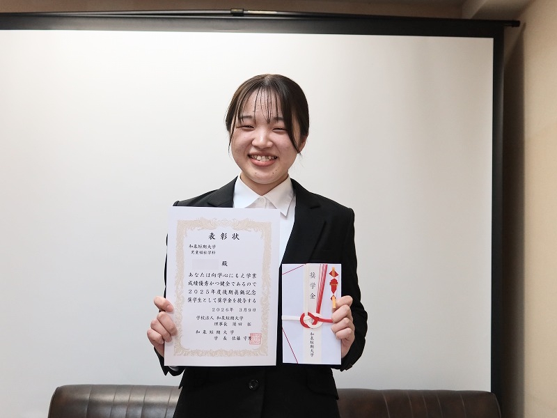 眞鍋記念奨学金は、本学設立に功績のあった、故 眞鍋頼一 元理事長の寄付を基礎として本学の建学の精神のもとに、社会に貢献すべき学生の育成を図るため、学業成績が優秀な学生に給付するものです。2025 年度後期 2 年生は、安田有花さん、塚本愛さん、専攻科生は、橋本空さんが受彰し、佐藤守男学長から表彰状と奨学金が授与されました。