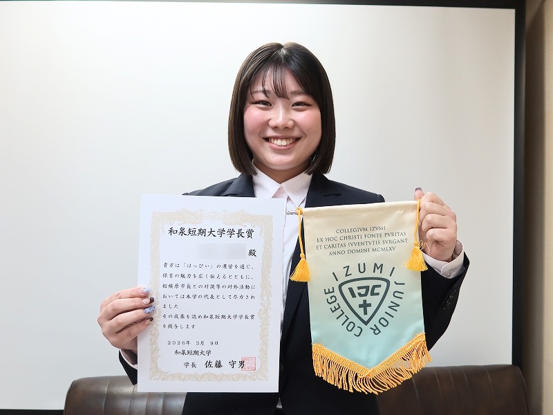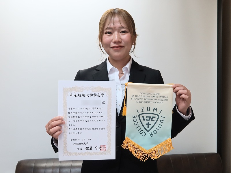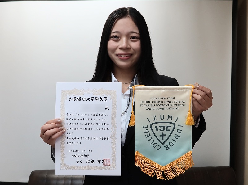 和泉短期大学学長賞は、課外活動で優秀な活躍をおさめ、学生生活に顕著な功績があった学生又は団体、社会活動で顕著な功績を残し、社会的に高い評価を受けた学生または団体に賞状と記念品を授与します。2025 年度後期は、水野希恵さん、小泉奈那さん、髙橋晴夏さん、ソーシャルワーク研究会、地域福祉ボランティア横地ゼミが受賞しました。