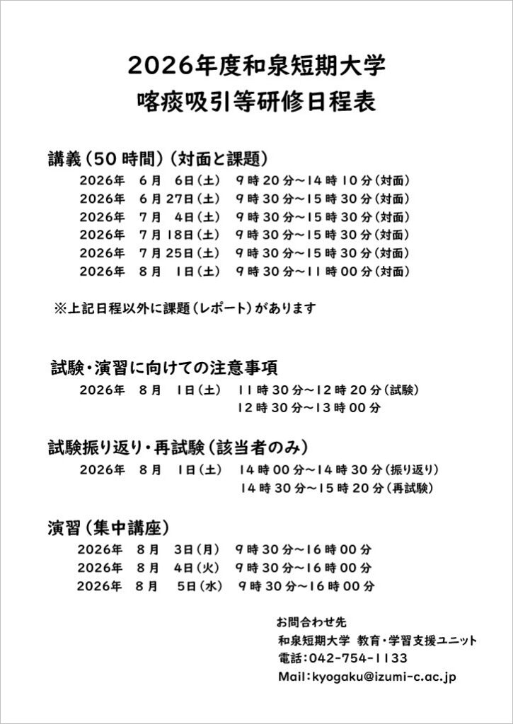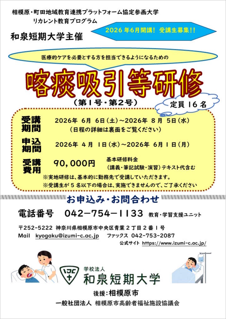 保育所や施設等において、医療的ケアを必要とする園児・利用者に対して、より安全にケアを提供するために、喀痰吸引等研修(神奈川県登録研修機関登録番号1410033)を実施します。