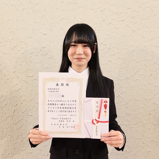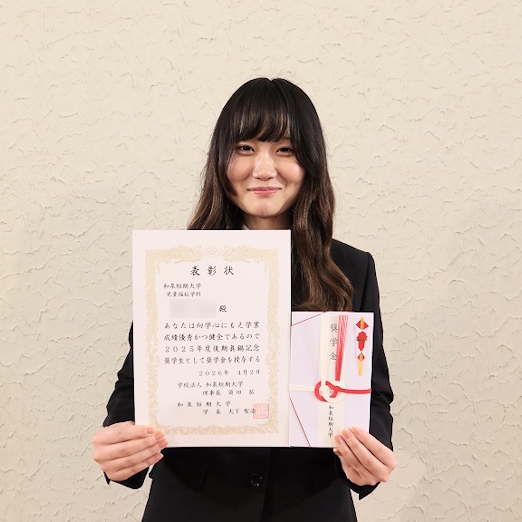 2025 年度後期奨学生として、篠音華さん、角田美玲さんの 2 名が表彰され、大下学長から表彰状と奨学費が授与されました。