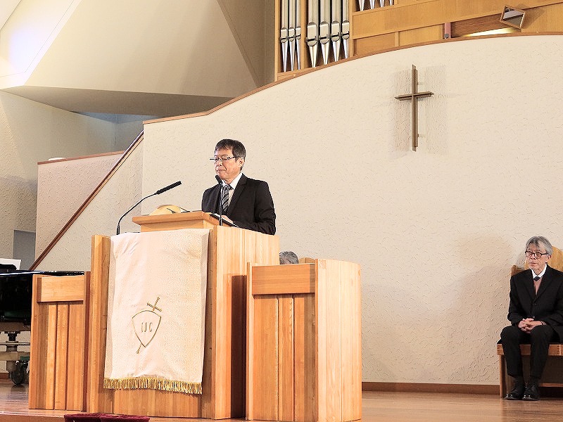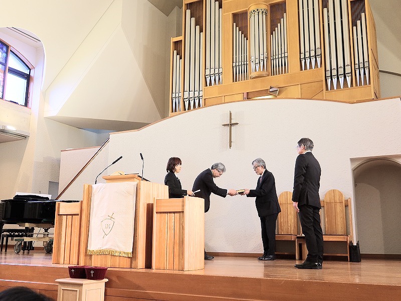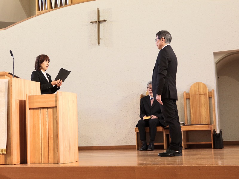 任職式は、今村愛喜チャプレンの司式で行われました。序詞、聖書朗読、祈祷、佐藤守男前学長から学長の聖書をチャプレンが預かり、大下新学長の誓約、祈祷後、学長の聖書の引き継ぎがなされ、須田拓理事長より新学長紹介の後、大下聖治第 9 代学長が就任挨拶を述べました。