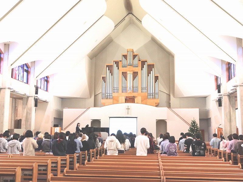 また、讃美歌の「主われを愛す」、「聖なる聖なる」、「いつくしみ深き」、「われをもすくいし」を学生と歌い、その歌詞からキリスト教の「愛」、「聖」、「赦し」、「恵み」についてお話して頂きました。