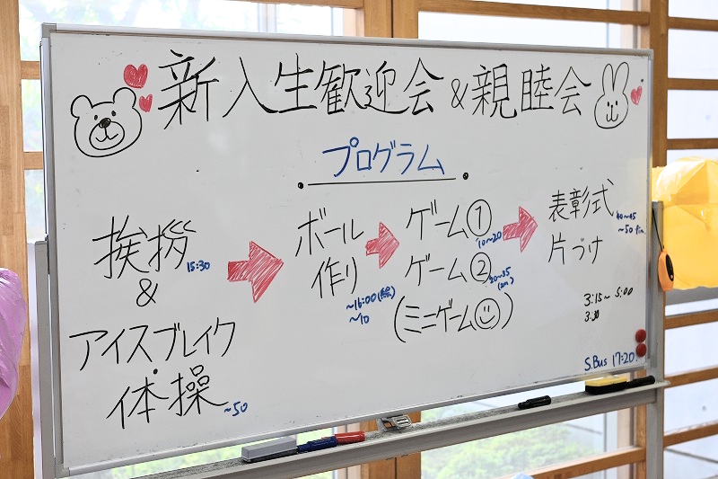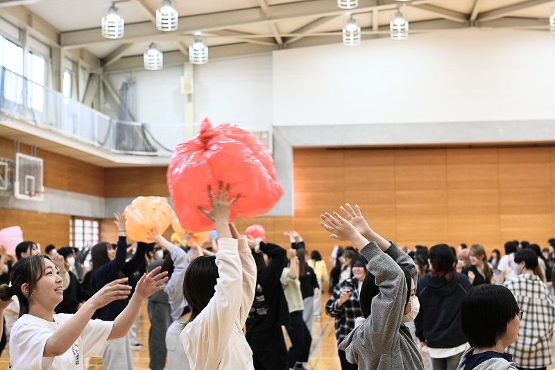学友会会長・副会長の挨拶の後、アイスブレイクの勝ち抜きじゃんけん、準備運動を行い、その後グループに分かれて本日のゲームに使うビニールボールを協力して作製しました。